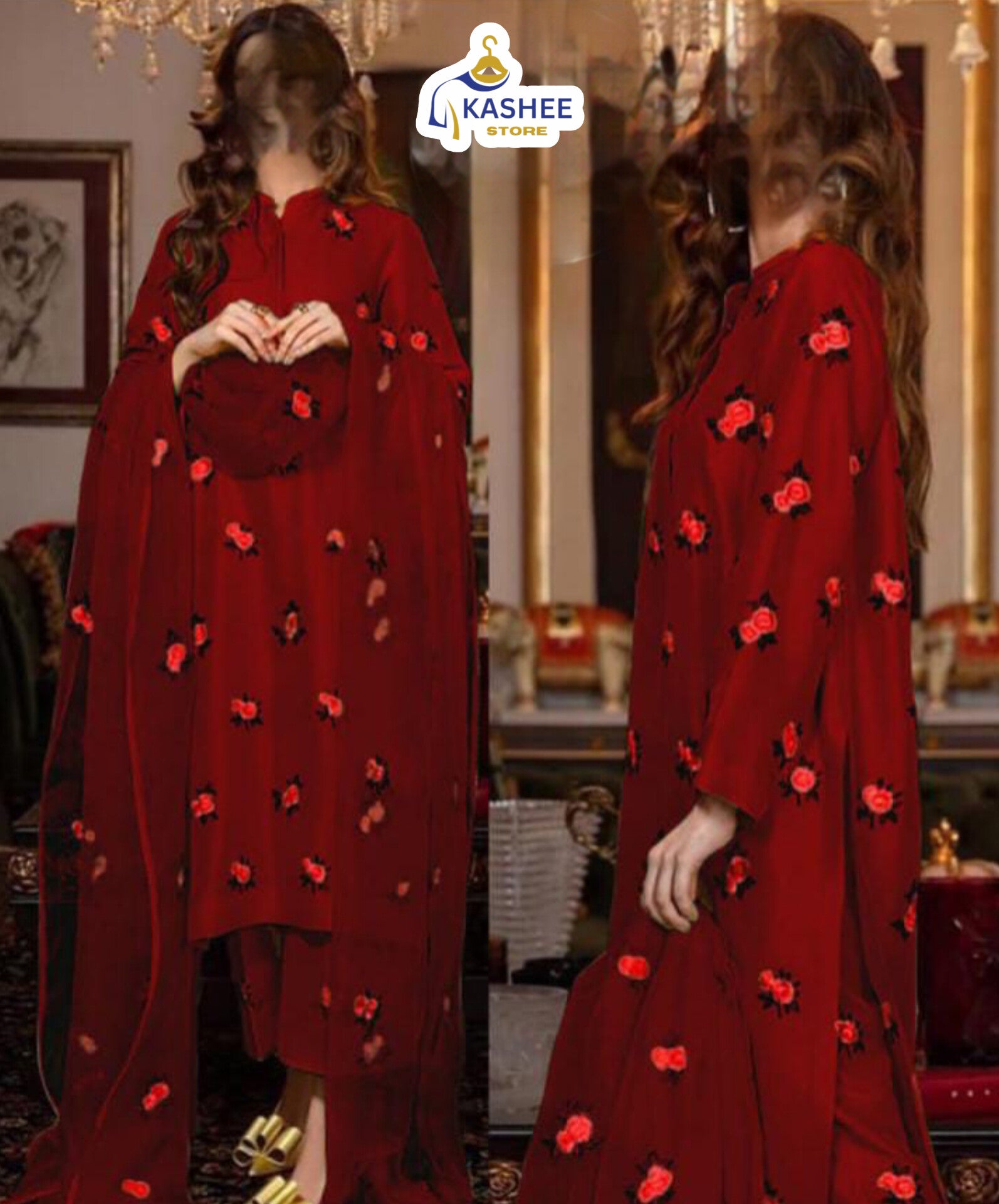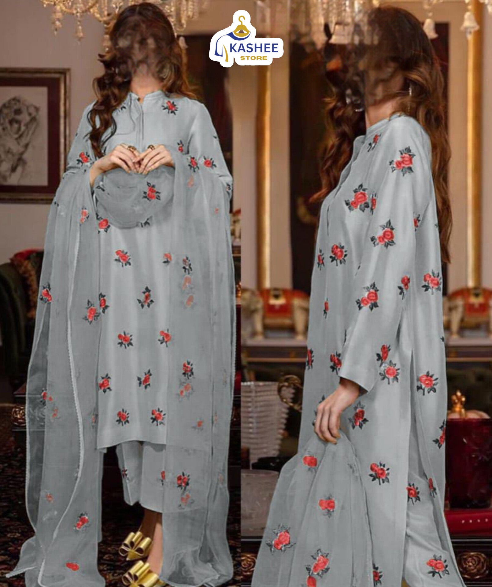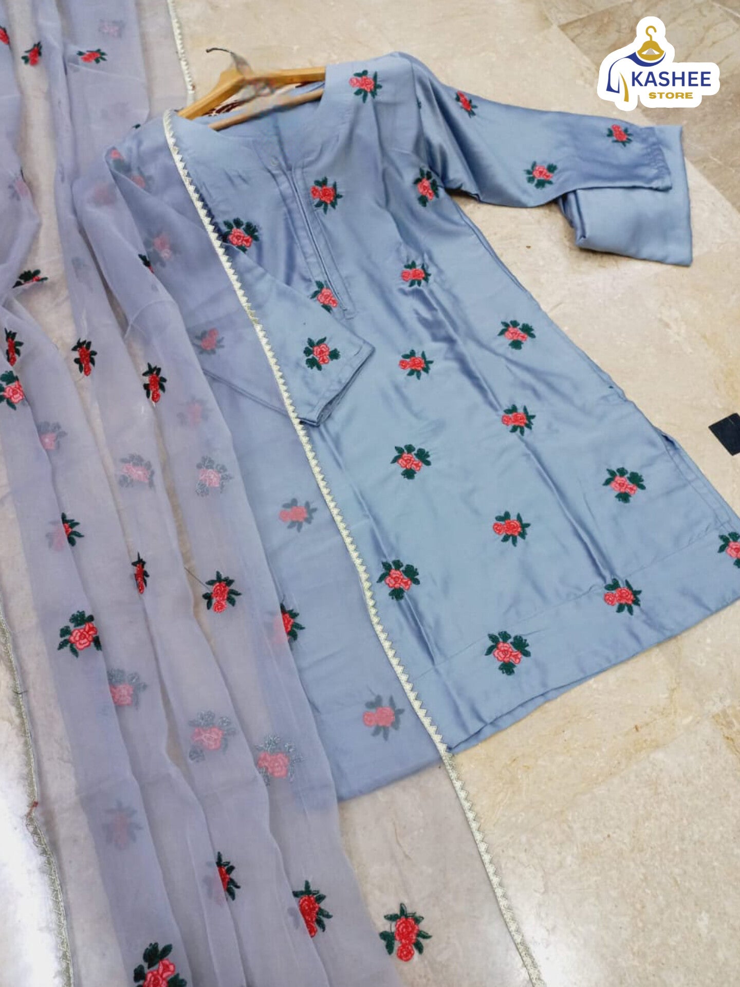 Rose Embroidered 3pc Suit – Shamose Silk with Organza Dupatta "