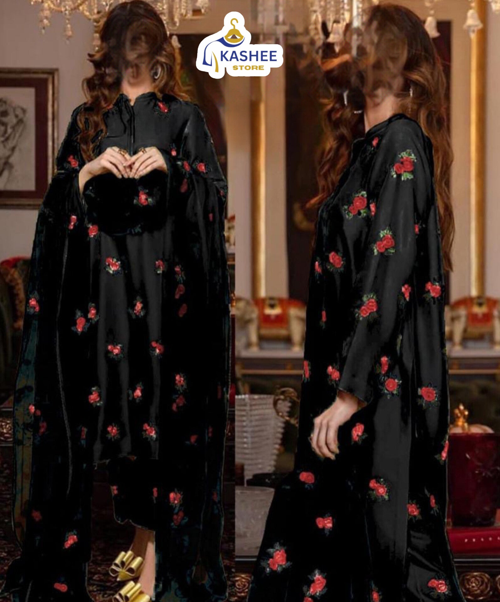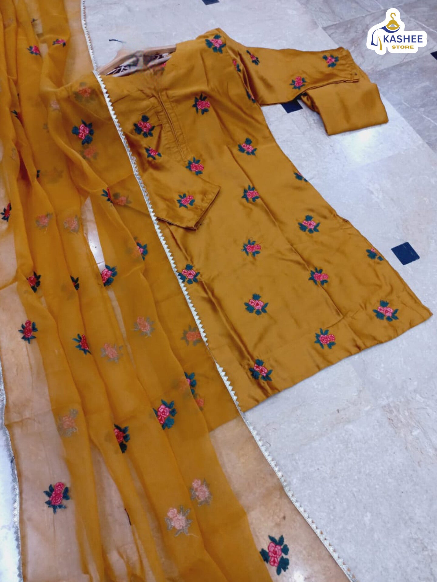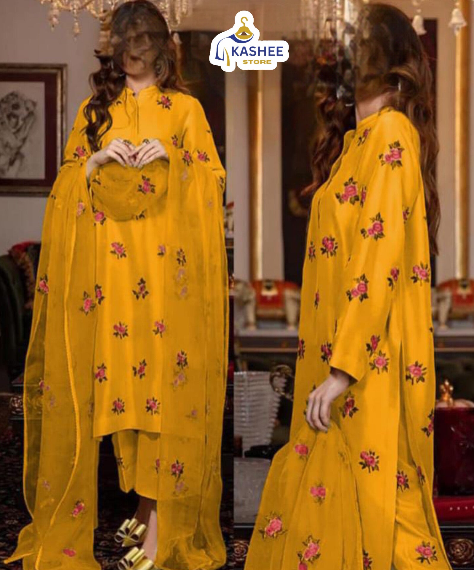 Rose Embroidered 3pc Suit – Shamose Silk with Organza Dupatta "